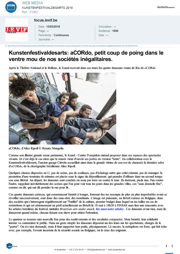aCORdo emerges from the invitation Alice Ripoll received to create a piece that should dialogue with the question of what would have remained as a legacy for the city after the great events that supposedly would bring improvements to Rio, the World Cup and the Olympics. Without giving a literally answer to the question, the artist proposes to think the city through the perspective of the performers she has been working with for eight years. They are black and live in a favela (slum).